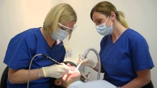 Hard and soft deposits including tartar plague and stains are removed from patients teeth by dental.